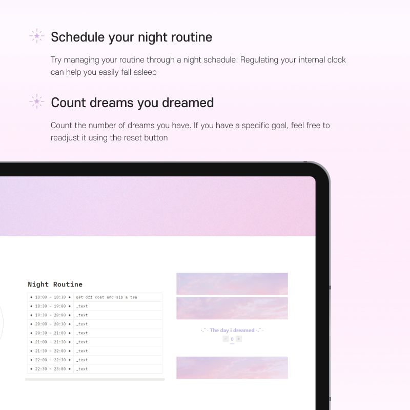 이번엔 꿈을 트래킹 할 수 있는 노션 템플릿을 제작했어요! 템플릿 기능은 다음과 같습니다.