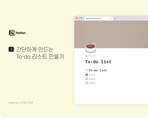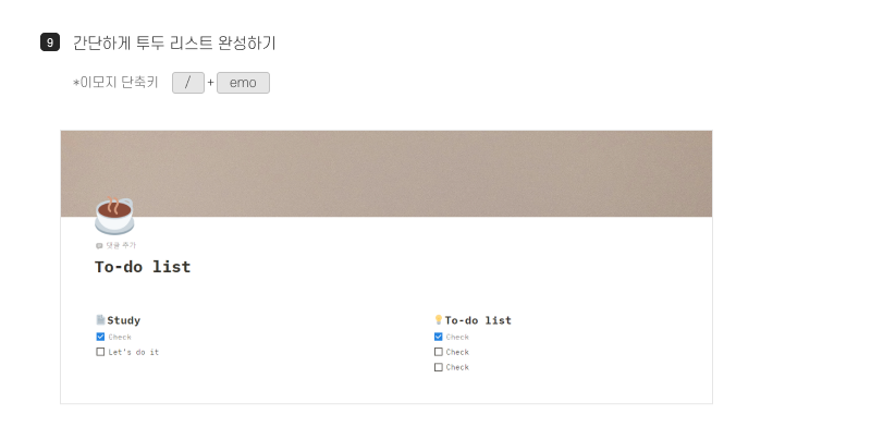 저는 위와 같은 방법으로 간단하게 투두리스트로 채워진 페이지를 만들어 봤어요.